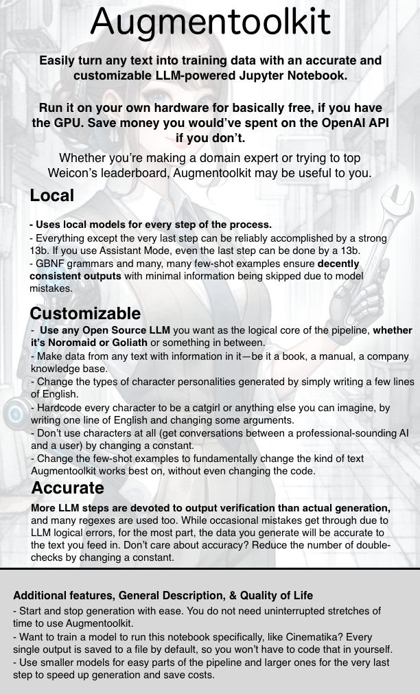Augmentoolkit is my attempt at solving our data problems. Put simply, Augmentoolkit is a way to make instruct-tuning data using compute and plaintext file(s) containing information about a subject. It focuses on accuracy, congifurability, and having a low barrier-to-entry. You can run most of it with a 13b (or all of it, settings-dependent). It's a Jupyter Notebook, so it should be easy to use and debug. It can generate RP-style data or user-assistant style data (though only the former has been extensively refined), so it's suitable for a whole bunch of different use cases.
