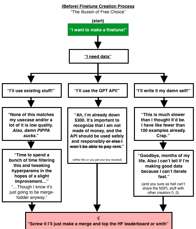 At this point you’ve read a decent amount of writing from me about why data is a pain point for open source model creators. I won’t bore you with more of the same words, I’ll just share this flowchart I made that I think sums up the problem succinctly, as a refresher:
