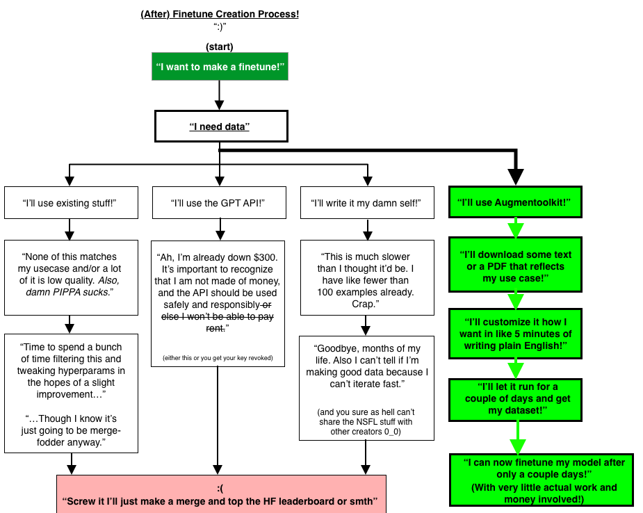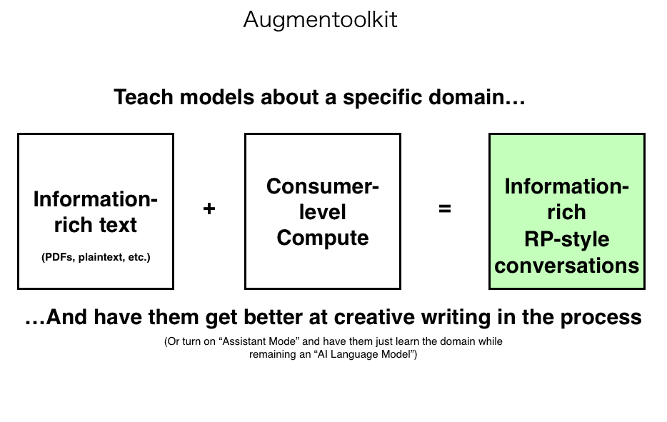 Augmentoolkit is meant to reduce data as a significant pain point for model creators. I want this to help democratize data generation. Even if you can manually write really good data for RP bots, or domain expert bots, or whatever, your writing ability cannot be 10Xed or 100Xed in scale—but your prompts CAN be. And feeding pretraining-style data into an instruct-tuned model as training data, in hopes of making a domain expert, is in no way ideal. This tool allows you to leverage text and writing ability to improve instruct-tuned models. With Augmentoolkit, hopefully, people can combine their GPUs to produce massive datasets that stick around forever (far more parallelizable than distributed training); or act individually to make data in their own niches of interest.