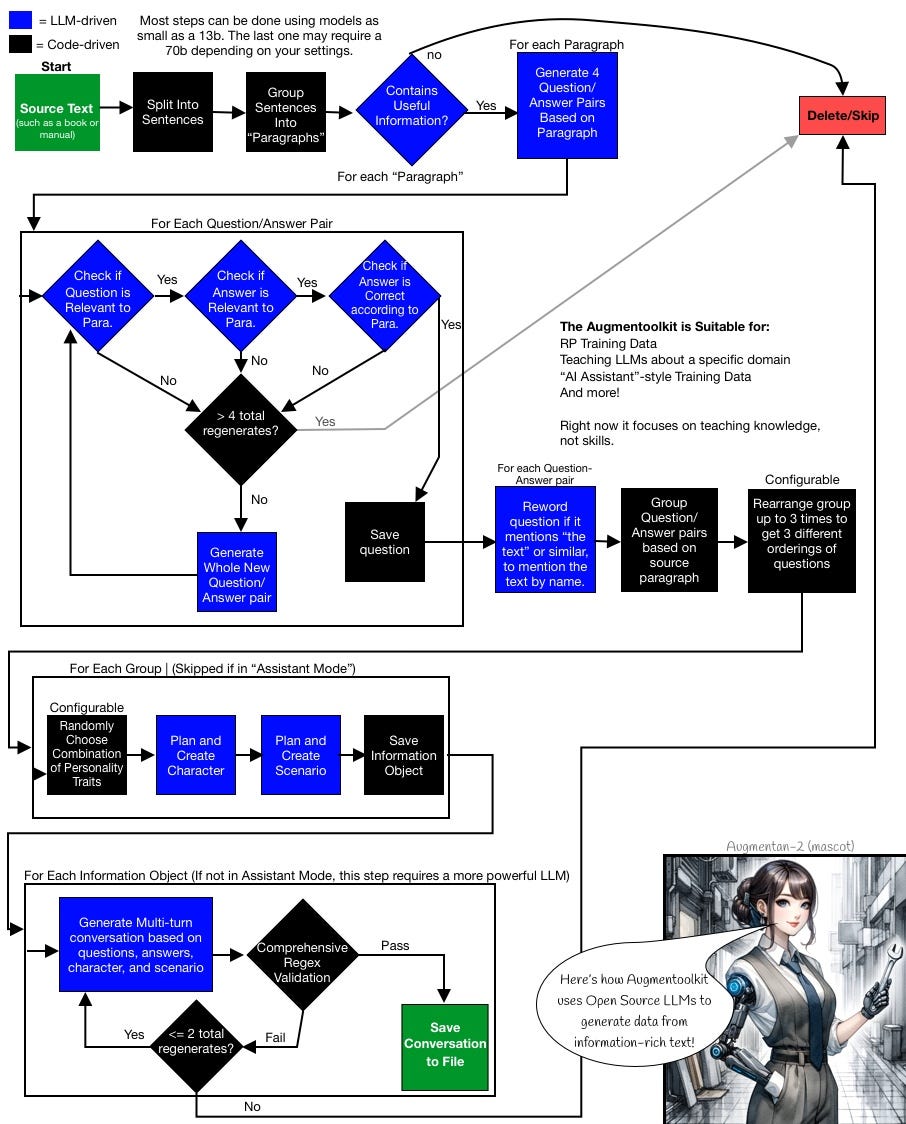 Augmentoolkit tries to allow basically anyone to make a good dataset about basically anything. At the very least, it shows that an automated approach involving converting human-written text is viable. Here’s a breakdown of some of the key ideas behind it in a more graphical form, presented by the tool’s mascot, Augmentan-2 (since all AI tools seem to have an AI-generated image mascot):